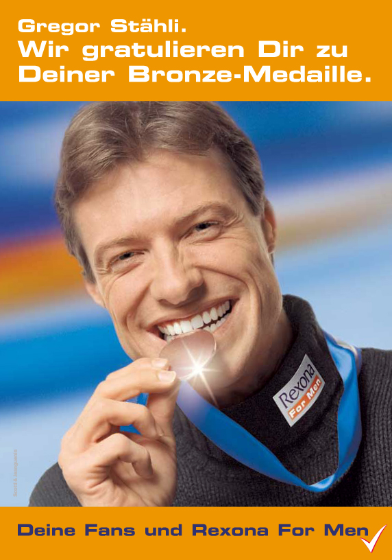 Als wir den Auftrag von Unilever für eine Rexona-Kampagne erhalten haben, waren die Vorgaben hoch. Die Kampagne sollte den Produktnutzen auf intelligente Weise in Spiel bringen, Image für die Marke generieren und auch noch die Abverkäufe steigern. Die eierlegende Wollmilchsau wurde gesucht, und gefunden. Glücklicherweise bestand eine Verbindung zwischen Rexona und Gregor Stähli, einem der besten Skeleton-Fahrer der Welt. Dieser sollte zur Olympiade zum Einsatz kommen. Durch intensive Gespräche mit Gregor und dem Kunden konnten wir die Idee entwickeln, die einem zum Schwitzen bringen konnte. «Finde heraus welchen Puls Gregor 3 Minuten vor seinem Start hat und gewinne ein Mental-Training in Tibet». Nachdem die logistischen Probleme der Pulsmessung mit dem Verband und anderen Instanzen geregelt waren, durften wir ein ein tolles shooting auf der Bobbahn in St. Moritz durchführen. Das Ergebnis konnte sich sehen lassen. Die Krönung war dann die Bronze-Medaille für Gregor Stähli. Denn auch die Produktion des Gratulations-Inserates über Nacht brachte uns dank Rexona for Men nicht ins schwitzen. Ausser vielleicht der Folgeauftrag, beim dem wir den bisherigen Erfolg noch übertreffen mussten.